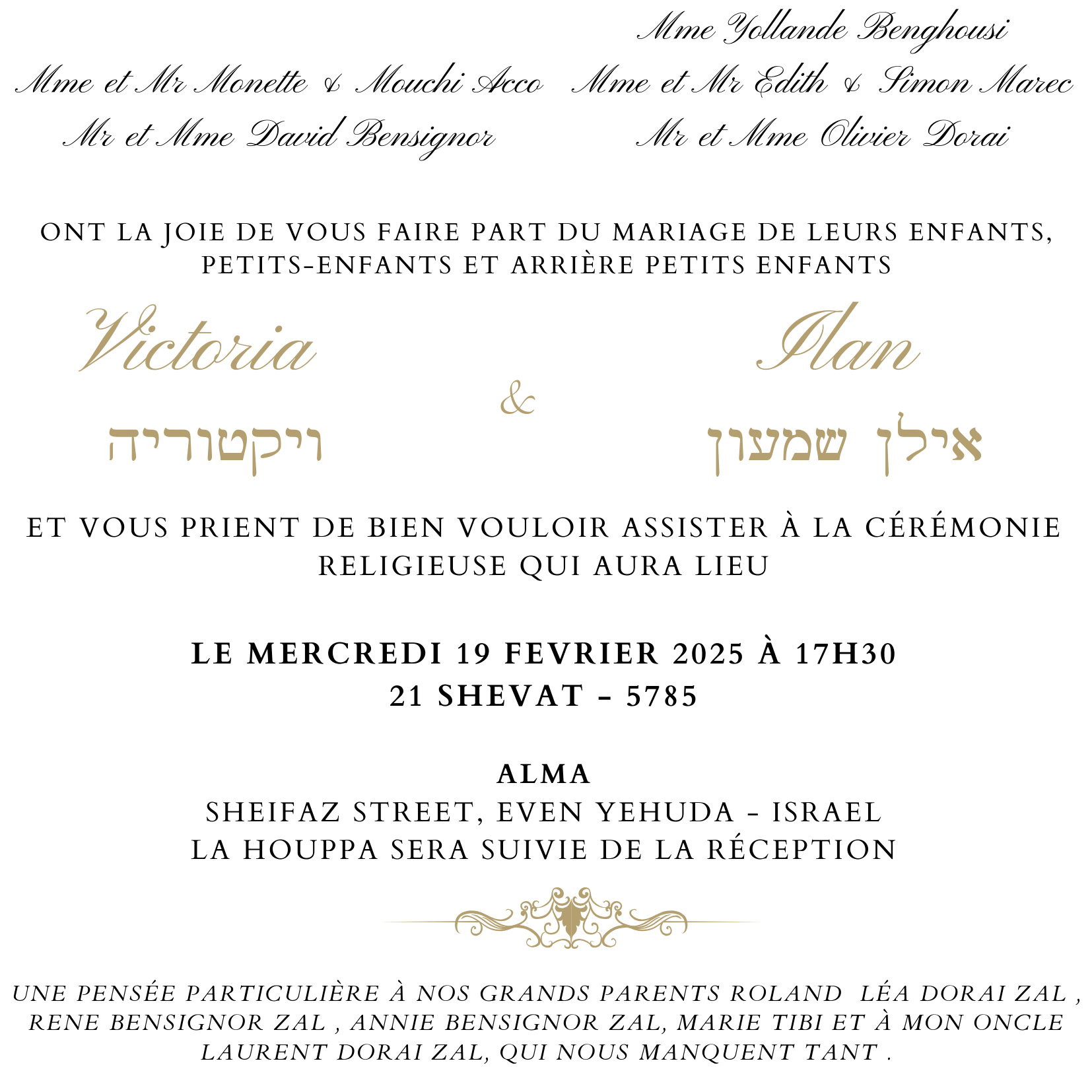 mairie Houppa & Soirée Confirmer Ma Présence Réponse souhaitée dès réception. Votre nom Votre prénom La réception - 19 fevrier 2025 AssisterontN'assisteront pas Nombre d'adultes 0123456 Nombre d'enfants 0123456 Message